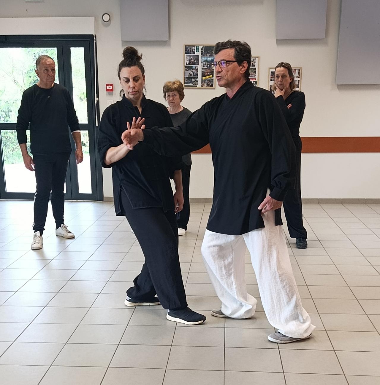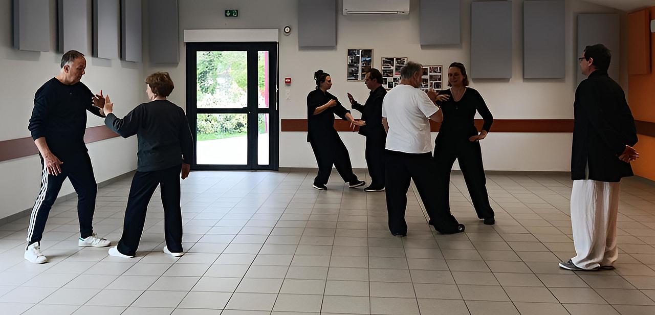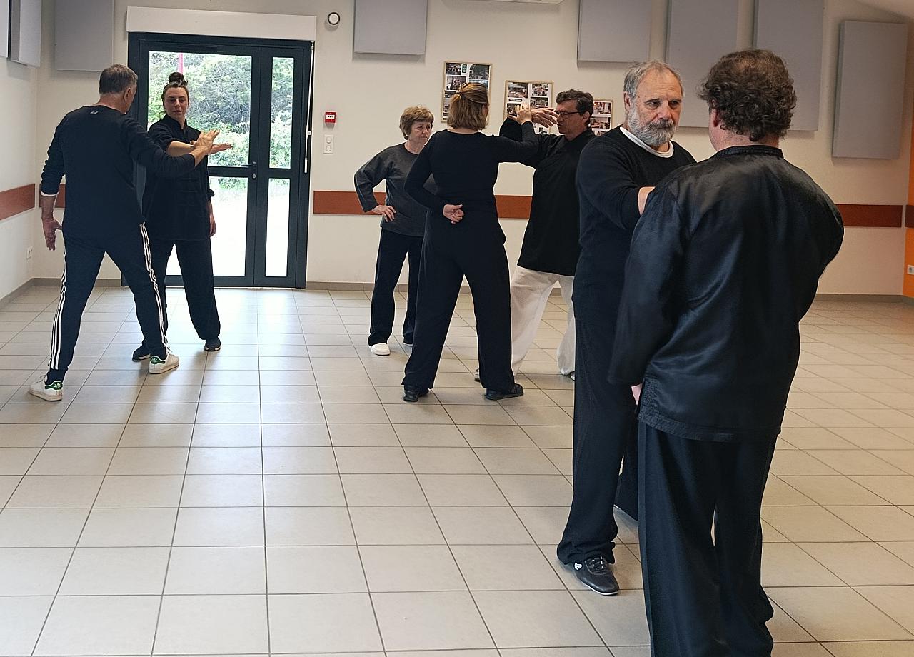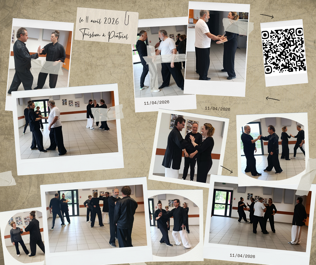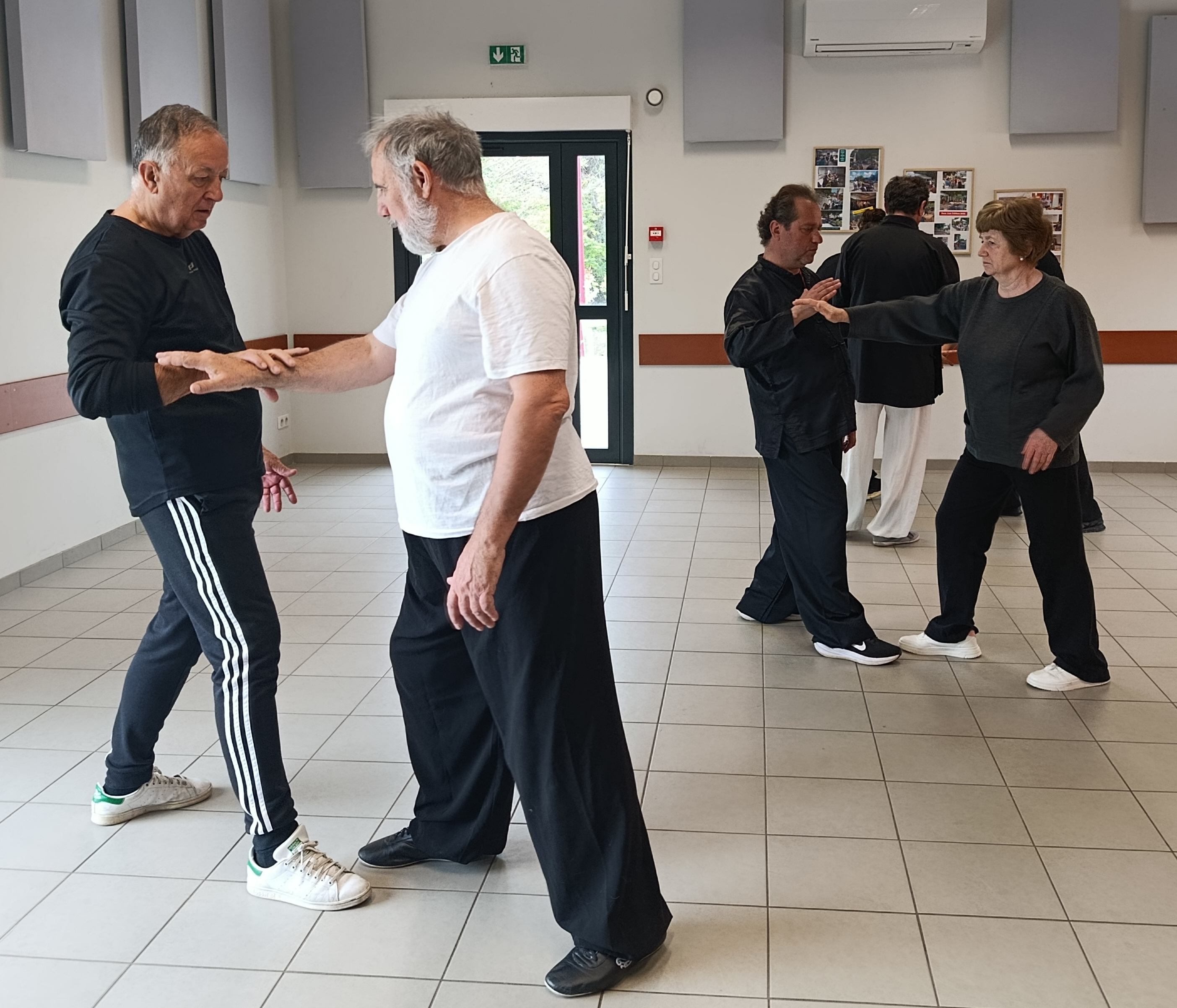 Le tuishou, « mains qui poussent », est un terrain d’expérimentation du taiji quan : un espace où le mouvement devient langage et la relation, écriture. À deux, il ne s’agit pas de vaincre mais de comprendre, d’écouter par le toucher et de répondre avec justesse. Dans la continuité des formes, le tuishou permet d’approfondir les principes internes : enracinement, disponibilité, transformation. Il affine la sensibilité, cultive l’équilibre entre soi et l’autre, et ouvre à une intelligence du geste à la fois martiale et nourrissante. Pratique d’échange, il engage le corps, l’attention et l’intention dans une dynamique de présence partagée.